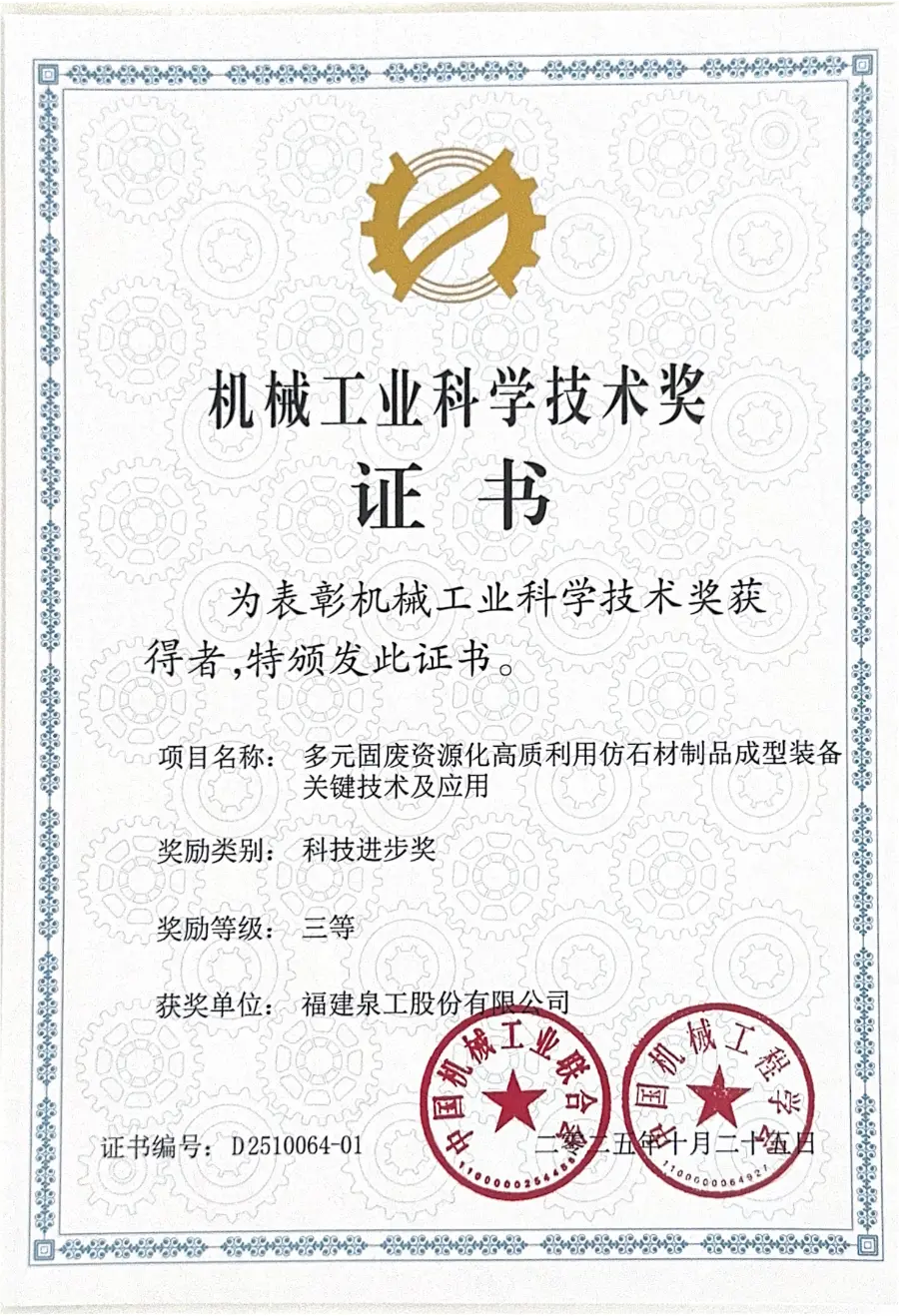 Nedávno bol oficiálne oznámený zoznam víťazov ceny China Machinery Industry Science and Technology Award 2025. Tretiu cenu za technologický pokrok získal projekt „Kľúčové technológie a aplikácie formovacích zariadení pre vysokohodnotné využitie diverzifikovaných zdrojov tuhého odpadu do výrobkov zo simulovaného kameňa“, pod vedením Fujian Quangong Machinery Co., Ltd. Toto ocenenie plne dokazuje vysoké uznanie oQuangong Machinery Co., Ltd.technologické inovačné schopnosti a úspechy inžinierskych aplikácií v oblasti vysokohodnotného využitia zdrojov pevného odpadu a inteligentných tvarovacích zariadení pre výrobky zo simulovaného kameňa.