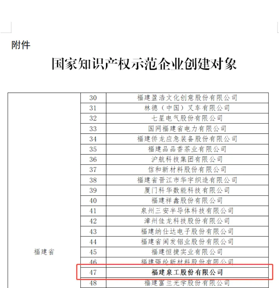 Nedávno vydala Národná správa duševného vlastníctva (CNIPA) „Oznámenie o výsledkoch hodnotenia demonštračných objektov budovania silných krajín v oblasti národného duševného vlastníctva“.Fujian Quangong Machinery Co., Ltd.bola úspešne vybraná ako „Národný objekt na vytváranie demonštračných podnikov duševného vlastníctva na roky 2025 – 2027“ na základe svojej komplexnej sily v oblasti tvorby, využívania, ochrany a správy duševného vlastníctva. Tento úspešný výber znamená autoritatívne uznanie úsilia spoločnosti Quangong Machinery Co., Ltd. na národnej úrovni pri presadzovaní vysokokvalitného rozvoja duševného vlastníctva a pri plnení národnej stratégie budovania silného národa duševného vlastníctva.